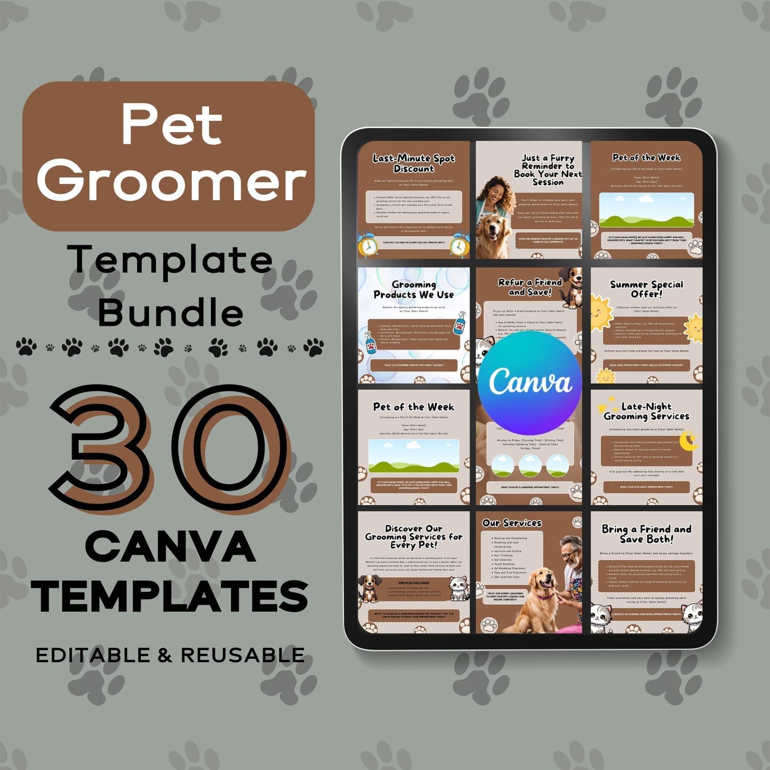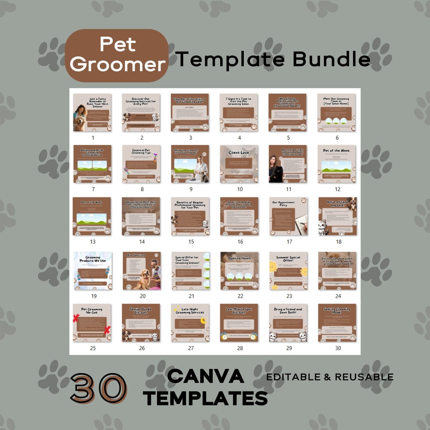 This bundle is packed with 30 professionally designed, easy-to-edit Canva templates created specifically for a pet grooming businesses.